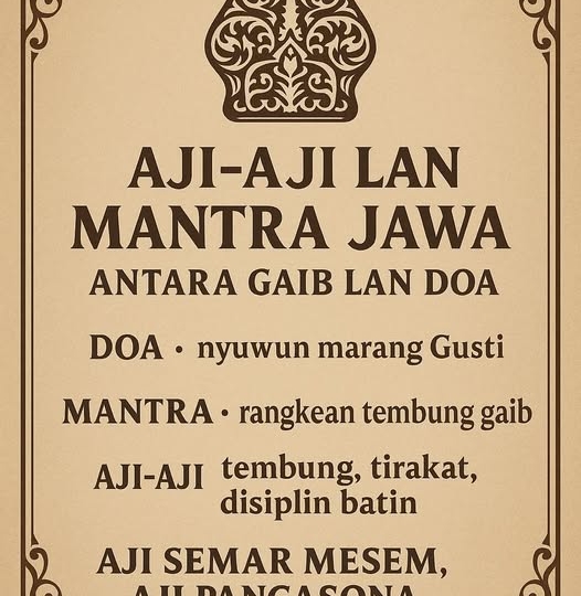 Aji-Aji lan Mantra Jawa: Antara Gaib lan Doa“Apa bener wong Jawa kuna nduwèni tembung sing yen diwaca bisa nggawe wong gumun, bisa nggugah rasa tresna, utawa malah bisa nguwataké awak saka serangan mungsuh?”Pitakon iki kerep muncul saben wong krungu istilah aji-aji lan mantra Jawa. Nanging, sejatine ajining tembung ing budaya Jawa luwih jero tinimbang mung sekadar gaib. Tembung sing metu saka tutuk iku ora mung swara, nanging uga energi batin. Lan ing kono bedane: ana sing dadi donga (doa), ana sing dadi mantra, lan ana sing dadi aji-aji.Bedane Doa, Mantra, lan Aji-Aji1. Doa (Donga)Doa iku panyuwunan tulus marang Gusti Kang Murbeng Dumadi.Basa sing digunakaké bisa Jawa, Arab, utawa basa saben dina.Tujuane luwih umum: nyuwun slamet, berkah, lan ketenangan.Conto: doa slametan desa, doa mangan, utawa doa syukur. Filosofiné: doa iku nyambungaké roh manungsa langsung karo Pencipta.2. MantraMantra luwih khusus: rangkaian tembung sing ngandhut irama lan makna simbolis.Basa sing digunakaké asring Kawi utawa Jawa kuna, amarga dipercaya luwih nggeteraké batin.Tujuane tartamtu: tolak balak, penglaris, kasehatan, lan proteksi.Conto: mantra tolak ula, mantra pengobatan tradisional. Filosofiné: mantra iku teknik konsentrasi batin kanggo ngarahaké energi liwat tembung.3. Aji-AjiAji-aji luwih dhuwur drajate: ora mung mantra, nanging uga kudu ana lelaku spiritual (tirakat, mutih, ngebleng, pati geni).Saben aji nduwé syarat lan aturan khusus.Ora mung kanggo kepentingan lahiriah, nanging kanggo nguwataké roso lan tekad batin. Filosofiné: aji-aji iku laku ngolah diri, latihan disiplin lan konsentrasi sing njalari daya tembungé luwih kuwat.Conto Aji-Aji Jawa sing Populer1. Aji Semar MesemFungsi: kanggo narik simpati lan disenengi wong liya (pengasihan).Makna simbolis: Semar iku pralambang welas asih lan kesederhanaan. Wong sing nduwé aji iki kudu nguwataké sikap ramah, andhap asor, lan sabar. Filosofi: “daya tarik sejati dudu saka mantra, nanging saka ati sing tulus.”2. Aji PancasonaFungsi: dianggep maringi kekebalan jasmani saka senjata.Lelaku: biasane tirakat abot kaya puasa lan tapa brata.Makna simbolis: awak kudu dilatih sabar lan kuat kaya watu. Filosofi: “kekebalan sejati yaiku kekuwatan sabar lan ora gampang rubuh nalika kena cobaan.”3. Aji JayengranaFungsi: nambah wibawa lan daya panguwasa.Makna simbolis: Jayengrana (tokoh wayang) ora mung gagah perang, nanging uga adil lan tegas. Filosofi: “wibawa ora saka tembung, nanging saka sikap sing adil lan tanggung jawab.”Makna Filosofis Aji lan Mantra JawaSaka conto iki katon yèn aji-aji lan mantra ora mung kanggo daya gaib lahiriah, nanging uga kanggo nglatih batin lan konsentrasi:Wong sing tirakat dadi luwih disiplin.Pikiran dadi fokus lan ora kesasar.Ati luwih resik, mula energi sing metu luwih nggeteraké.Intiné: wong sing bisa nguwasani aji-aji iku dudu mung wong sing nduwé ilmu gaib, nanging wong sing wis nguwasani awaké dhewe.Pitutur Leluhur“Sing luwih utama saka aji-aji yaiku aji diri – nguwasani hawa nafsu, ngresiki batin, lan ora gawe susah wong liya.”