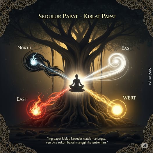 Sedulur Papat, Kiblat Papat, Warna lan Watak ManungsaIng kawruh kasepuhan Jawa, manungsa iku dudu mung ragane kemawon. Ana sangkan paran kang jembar, gegandhengan antarane jagad alit (diri pribadi) lan jagad ageng (alam semesta). Saka kono, kawruh Jawa ngenal tembung Sedulur Papat kang nglantarake lairipun manungsa, sesarengan karo Kiblat Papat minangka pangarahing urip.1. Sedulur Papat minangka kawruh uripSedulur Papat iku pralambang anane papat kekuwatan gaib sing ngancani manungsa wiwit kawiwitan nganti pungkasan:Getih (abang)Ari-ari (putih)Air ketuban (ijo)Puser (kuning)Nalika jabang bayi lahir, papat mau metu sesarengan minangka panyengkuyung. Nanging, sajroning laku spiritual Jawa, Sedulur Papat ora mung dipahami minangka barang fisik, nanging uga roh penjaga sing tansah ngancani manungsa saben lakone.2. Kiblat Papat minangka arah uripManungsa dumunung ana ing tengah, diarani Pancer. Ing sakupenge ana Kiblat Papat, kang ngemu makna arah lan kekuwatan:Timur (wetanan) → lambang abang, unsur geni, watak semangat, karep, karsa.Selatan (kidul) → lambang putih, unsur banyu, watak sabar, pasrah, welas asih.Barat (kulon) → lambang kuning, unsur angin, watak pinter, eling, waspada.Lor (utara) → lambang ijo, unsur bumi, watak teges, teguh, kukuh.Pancer ana ing tengah minangka pusat, yaiku sangkan paraning dumadi, manungsa sing kudu bisa ngimbangi lan ngemong papat arah kuwi supaya ora mblundhuh uripe.3. Warna minangka pralambang batinSaben arah lan sedulur papat kagandheng karo warna tartamtu, kang ora mung minangka rupaning cahya nanging uga pralambang rasa batin:Abang (merah) → gegandhengan karo getih, geni, gegayuhan lan ambisi.Putih → lambang kesucian, sabar, bening pikiran.Kuning → pralambang kecerdesan, kawicaksanan, waskita.Ijo → pralambang kesuburan, keteguhan, manunggaling rasa karo bumi.Manungsa sing bisa nguwasani lan ngimbangi warna papat iki bakal manggoni kasampurnan urip, ora kegawa hawa nepsu nanging bisa tetep eling lan waspada.4. Watak manungsa ing pancerSedulur Papat lan Kiblat Papat kabeh makili sipat-sipat kang ana sajroning diri manungsa. Nanging pancer — yaiku aku sejati — kudu bisa ngemong lan nuntun kabeh supaya dadi siji harmoni. Yen ora, manungsa bakal kecemplung salah siji sipat, dadi nesu, serakah, utawa kebacut alon tumindak.5. Laku eling lan waspadaKawruh Jawa tansah ngandharake, yen manungsa urip kudu eling lan waspada. Eling marang sangkan paraning dumadi, waspada marang sedulur papat lan arah papat sing tansah ngupaya narik batin marang sipate dhewe. Manungsa kang bisa ngimbangi kabeh, bakal manggoni urip ayem, tentrem, lan manunggal karo rasa sejati. Serat pungkasan:Sedulur Papat lan Kiblat Papat ora mung gegandhengan karo lahir lan jagad njaba, nanging uga pratandha yen saben manungsa kudu nyawiji karo sangkan paran. Ing kono, kawruh Jawa ora mung ngajari ngudi kamulyan donya, nanging uga ngupaya katentreman batin kang sajati.