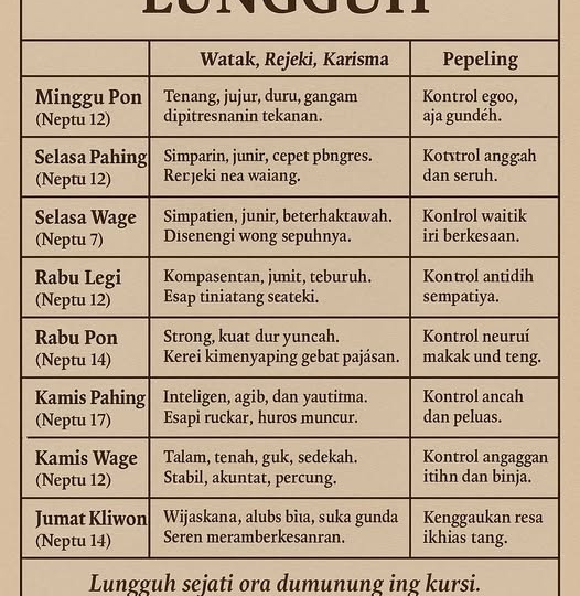 WETON TIBO LUNGGUH(Nasib Mulya lan Ujian Batin Miturut Piwulang Jawa)—1. Tegesipun Tibo LungguhTembung tibo lungguh tegesipun “jatuh langsung lungguh”, pralambang bilih tiyang ingkang lair wonten weton tartamtu kagungan nasib mulya, gampang entuk pangkat, pakurmatan, lan rejeki, saengga kados “jatuh langsung lungguh” ing kursi luhur.Nanging, ing piwulang Jawa, punika dudu hadiah murni, nanging ujian spiritual. Wong sing pinanggih lungguh kudu tansah eling lan ngati-ati, amargi pepadhang sing sumunar tansah narik pepeteng.—2. Hubungan karo Tradisi Spiritual JawaSedulur Papat Kalimo Pancer: Wong tibo lungguh dipunpitados luwih kuwat pangayomané Sedulur Papat (Kawah, Ari-ari, Getih, lan Puser), saengga gampang pinanggih rejeki lan perlindungan gaib.Karisma lan Aura: Wong iki seolah kagungan “wangi batin” sing narik rasa tresna lan pakurmatan.Ujian: Kedudukan luhur gampang gawe gumedhé, mula leluhur ngelingaké:> “Wong lungguh kudu bisa nglungguhaké ati, dudu mung awaké.”—3. 8 Weton Tibo Lungguh lan Maknané1) Minggu Pon (Neptu 12)Watak: tenang, jujur, gampang dipitresnani wong.Rejeki: ora adoh saka pangan, kerep entuk berkah dadakan.Karisma: disenengi masyarakat, kerep dadi panutan.Laku tirakat: puasa mutih lan semedi saben weton kanggo ngresiki ego.—2) Selasa Pahing (Neptu 12)Watak: cekatan, sregep, gigih.Rejeki: gampang entuk pangkat utawa kedudukan gedhé.Karisma: nduwé aura pamimpin.Laku tirakat: tapa bisu lan ngamal, supaya tegesé ora kasar.—3) Selasa Wage (Neptu 7)Watak: sederhana, jujur, alus budi.Rejeki: rejeki cukup lumintu, ora nganti kekurangan.Karisma: disenengi wong sepuh amarga andhap asor.Laku tirakat: tirakat ngrowot kanggo nguataké rasa sabar lan nerimo.—4) Rabu Legi (Neptu 12)Watak: welas asih, jujur, gampang dipercaya.Rejeki: kerep mlebu jabatan terhormat.Karisma: asring dadi teladan masyarakat.Laku tirakat: puasa weton lan semedi tengah wengi, ngresiki pikiran.—5) Rabu Pon (Neptu 14)Watak: tegas, semangat, kerja keras.Rejeki: lawang rejeki kathah, kerep entuk jabatan.Karisma: dipercaya kalangan panguwasa.Laku tirakat: reresik tembung (ngurangi gupuh lan nesu).—6) Kamis Pahing (Neptu 17)Watak: cerdas, cekatan, nduwé wibawa.Rejeki: gampang sugih lan makmur.Karisma: daya tarik sosial dhuwur.Laku tirakat: semedi lan dzikir ambegan supaya aura positif lestari.—7) Kamis Wage (Neptu 12)Watak: ayem, tenang, alus roso.Rejeki: cukup lan stabil, ora gampang kekurangan.Karisma: disenengi amarga wataké sabar.Laku tirakat: puasa mutih lan sedekah kanggo nyingkiraké iri wong liya.— Jumat Kliwon (Neptu 14)Watak: wicaksana, alus budi, seneng maringi pitutur.Rejeki: kerep entuk berkah tanpa disangka.Karisma: aura spiritual kuwat, kerep dadi pangayom.Laku tirakat: tirakat ngebleng (yen kuwat) utawa puasa mutih kanggo nggedhekaké rasa ikhlas.—4. Makna Spiritual lan SosialWong tibo lungguh ora mung ditakdiraké mulya, nanging uga diberi tanggung jawab gaib lan sosial kanggo ngluhuraké masyarakat.Kedudukan sing gampang dipinanggih kudu digandhengaké karo andhap asor lan amal, supaya lungguh dadi pepadhang, dudu pepesthi.Pepeling Jawa:> “Sing lungguh kudu nglungguhaké liyan, dudu mung ngangkat awake dhewe.”—5. Laku Kang DisarankéPuasa weton: ngresiki sukma.Semedi tengah wengi: nyawiji karo pancer lan Gusti.Ngamal: maringi berkah marang wong cilik.Andhap asor: ora gumedhé, sanadyan disenengi wong.Ngendhaleni tembung: amarga saben ukara saka wong lungguh luwih abot timbang liyane.—6. PanutupWeton Tibo Lungguh minangka pralambang nasib mulya lan kehormatan luhur, nanging ing piwulang Jawa, punika dudu babagan bathi pribadi kemawon. Wong sing lair ing weton iki sejatine diparingi ujian spiritual:Apa lungguhé kanggo ngluhuraké diri, utawa kanggo ngluhuraké bebrayan lan Gusti.> “Lungguh sejati ora dumunung ing kursi, nanging ana ing ati sing tansah resik lan migunani tumrap liyan.”— Ringkesan:Tibo Lungguh = gampang entuk rejeki lan pangkat.Ana 8 weton utama: Minggu Pon, Selasa Pahing, Selasa Wage, Rabu Legi, Rabu Pon, Kamis Pahing, Kamis Wage, lan Jumat Kliwon.Makna spiritual = titipan lan ujian.Laku = puasa weton, semedi, ngamal, andhap asor.—