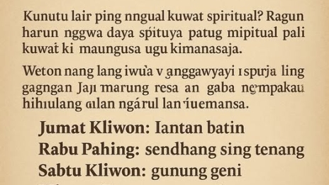 Rahasia Spiritual Weton: Ajian & Doa Jawa Weton Paling Kuwat Spiritualé: Wahyu Rasa lan Pagar Gaib Manungsa… Lihat selengkapnya PROMPT : Weton...
